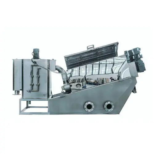 疊螺主體是由固定環(huán)和活動(dòng)環(huán)相互層疊成圓筒,螺旋軸貫穿其中行程的一種過濾裝置。因螺旋軸的外徑比活動(dòng)環(huán)的內(nèi)徑大,所以螺旋軸的旋轉(zhuǎn)就帶動(dòng)活動(dòng)環(huán)做圓周運(yùn)動(dòng),防止堵塞。固定環(huán)和活動(dòng)環(huán)之間的空隙沿著泥餅出口方向,從濃縮部到脫水部逐漸變小。污泥在濃縮部通過重力濃縮后,被運(yùn)輸?shù)矫撍?,在排出口背壓板產(chǎn)生的內(nèi)壓作用下達(dá)到強(qiáng)行脫水。